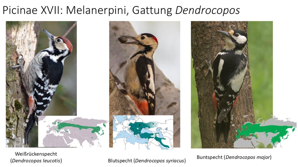 Die Gattungsgruppe Melanerpini hat 13 Gattungen. Die Saftlecker (Sphyrapicus) umfassen vier Arten aus Nordamerika. Ausschließlich in Nord- und Südamerika heimisch sind die Gattungen Melanerpes mit 23-24 Arten und Leuconotopicus mit 6 Arten. In Mittel- und Südamerika kommt die Gattung Veniliornis mit 14 Arten vor. Die Gattung Xiphidiopicus hat nur eine Art, den Blutfleckspecht (Xiphidiopicus percussus), der in Kuba lebt. In Asien kommen die Gattungen Yungipicus mit 7 Arten vorwiegend in den Tropen und Leiopicus mit einer Art auf dem indischen Subkontinent vor. In Afrika leben die Gattungen Chloropicus mit 3 Arten und Dendropicos mit 12-13 Arten. Zur Gattung Dendrocoptes gehören drei Arten, die in Europa und Asien vorkommen. Hierzu zählt auch der in Mitteleuropa heimische Mittelspecht (Dendrocoptes medius). In diese Gattung gehört auch der Arabienspecht (Dendrocoptes dorae), der früher in die afrikanische Gattung Dendropicos gestellt wurde. Die Gattung Dryobates hat 5-6 Arten und kommt in Europa, Asien und Nordamerika vor, darunter der auch der in Mitteleuropa brütende Kleinspecht (Dryobates minor). Die Gattung Picoides lebt in den gemäßigten Zonen Nordamerikas und Eurasiens, darunter der Dreizehenspecht (Picoides tridactylus). Die Gattung Dendrocopos hat 12-13 Arten, die über weite Teile des tropischen und gemäßigten Asiens, sowie Europa vorkommen. In diese Gattung gehören auch Weißrücken- (Dendrocopos leucotis), Blut- (Dendrocopos syriacus) und Buntspecht (Dendrocopos major), die in Mitteleuropa vorkommen.