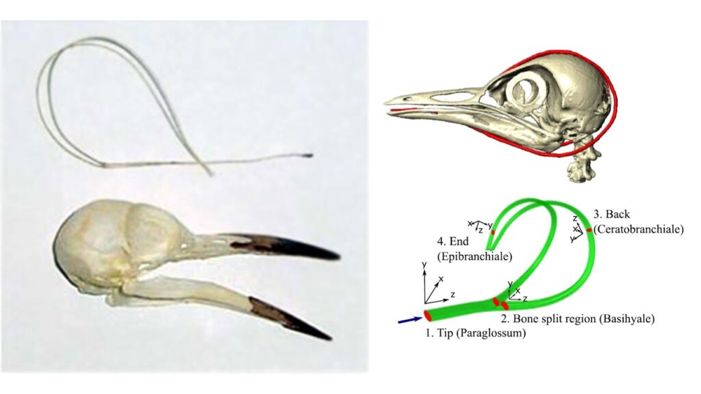 Die Spechtzunge ist außergewöhnlich spezialisiert. Im Gegensatz zur menschlichen Zunge, die hauptsächlich aus Muskeln besteht, wird die Zunge der Vögel vom Zungenbeinapparat starr gehalten. Alle Wirbeltiere haben Zungenbeine in der einen oder anderen Form; auch wir haben ein u-förmiges Zungenbein und dieser dient als Ansatzpunkt für bestimmte Muskeln des Rachens und der Zunge.