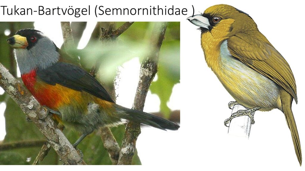 Die Tukanbartvögel oder Zinkenschnäbel (Semnornithidae) haben zwei Arten – Tukanbartvogel (Semnornis ramphastinus) und Azteken-Bartvogel (Semnornis frantzii) – in einer Gattung und sind mit den Tukanen näher verwandt als mit den Amerikanischen Bartvögeln. Sie sind verhältnismäßig große Bartvögel und werden 18-22 cm lang. Der Azteken-Bartvogel, der die Bergwälder von Costa Rica und Panama bewohnt, ist insgesamt eher olivgrünlich mit einer matt orangebraunen Brust. Der Tukan-Bartvogel, der in den Bergwäldern Ecuadors und Kolumbiens lebt, ist dagegen deutlich farbenprächtiger und zeichnet sich durch einen schwarzen Oberkopf, eine hellgraue Kehle, eine leuchtend rote Brust sowie einen kräftig goldorangen Bürzel und Flanken aus (Winkler et al. 2015, 2020b, Del Hoyo et al. 2002, Del Hoyo 2020, Ostrow et al. 2023).