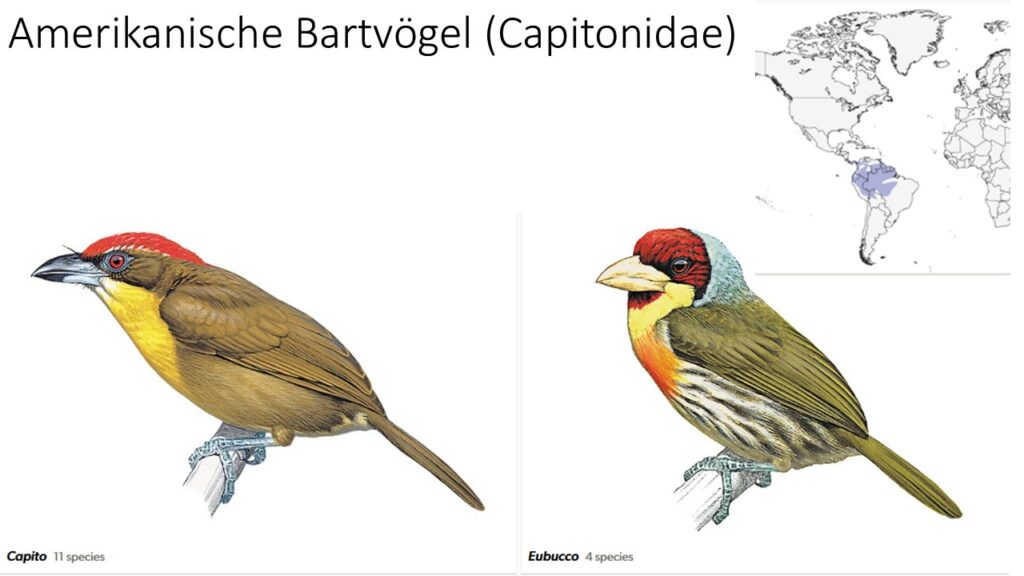 Die Amerikanischen Bartvögel (Capitonidae) kommen in 15-18 Arten in zwei Gattungen in den Regenwäldern Mittel- und Südamerikas vor. Sie sind in der Regel sehr bunt und zeigen grüne, rote, gelbe, weiße oder schwarze Tönungen. Dabei sind Männchen in der Regel farbiger als die Weibchen. Amerikanische Bartvögel werden 15 bis 20 Zentimeter lang. Der Rumpf ist kurz, der Hals kurz und dick und der Kopf kann im Verhältnis zum Körper relativ groß sein. Der Schnabel ist kurz und dick und weist an den Kanten oft eine Sägung auf. Im Vergleich zu anderen Bartvögeln besitzen Amerikanische Bartvögel nur wenige und kurze Borsten an der Schnabelbasis. Die Rufe der Amerikanischen Bartvögel ähneln denen kleiner Eulen (Winkler et al. 2015, 2020c, Del Hoyo et al. 2002, Del Hoyo 2020).