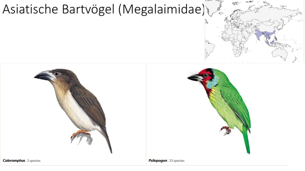 Die Asiatischen Bartvögel (Megalaimidae) leben mit 35 Arten in 2 Gattungen in den Wäldern des tropischen Asiens. Während die 2 Arten der Gattung Calorhamphus bräunlich gefärbt sind, dominieren bei der Gattung Psilopogon Grüntöne. Beide Gattungen trennten sich vor etwa 21 Mio. Jahren und werden von manchen auch als zwei Unterfamilien anerkannt (Winkler et al. 2015, 2020d, Del Hoyo et al. 2002, Del Hoyo 2020, den Tex & Leonard 2013, David 2008).