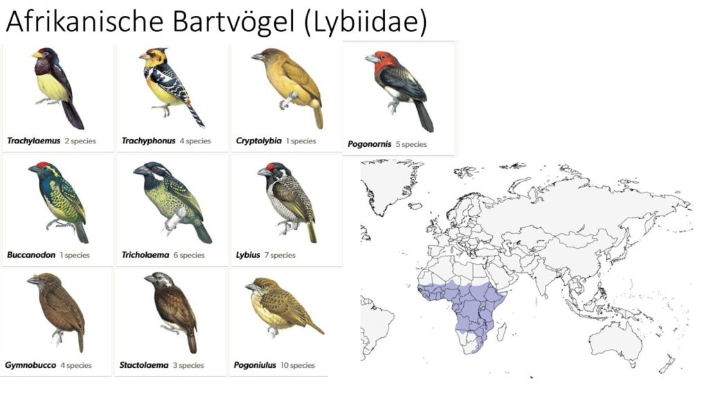 Die Afrikanischen Bartvögel (Lybiidae) sind mit bis zu 51 Arten in 9-10 Gattungen die artenreichste Bartvogelfamilie. In Afrika bewohnen Bartvögel nicht nur die tropischen Regenwälder, viele Arten kommen auch in der Savanne vor. Hier finden sich innerhalb der Gattung der Zwergbartvögel (Pogoniulus), bei denen viele Arten etwa 10 cm lang werden, die kleinsten Bartvögel der Welt. Ein besonders auffälliger Bartvogel der afrikanischen Savannen ist der Flammenkopf-Bartvogel (Trachyphonus erythrocephalus), dessen Lautäußerungen zu den typischen Lauten der ostafrikanischen Savanne gehören. Typische Vertreter der afrikanischen Wälder sind z. B. der Gelbfleck-Bartvogel (Buccanodon duchaillui) und die Gattung der Borstenbärtlinge (Gymnobucco), bei denen die meisten Arten ein unbefiedertes Gesicht haben. Afrikanische Bartvögel ernähren sich wie ihre Verwandten in Asien und Südamerika hauptsächlich von Insekten und Früchten (Winkler et al. 2015, 2020e, Del Hoyo et al. 2002, Del Hoyo 2020).
