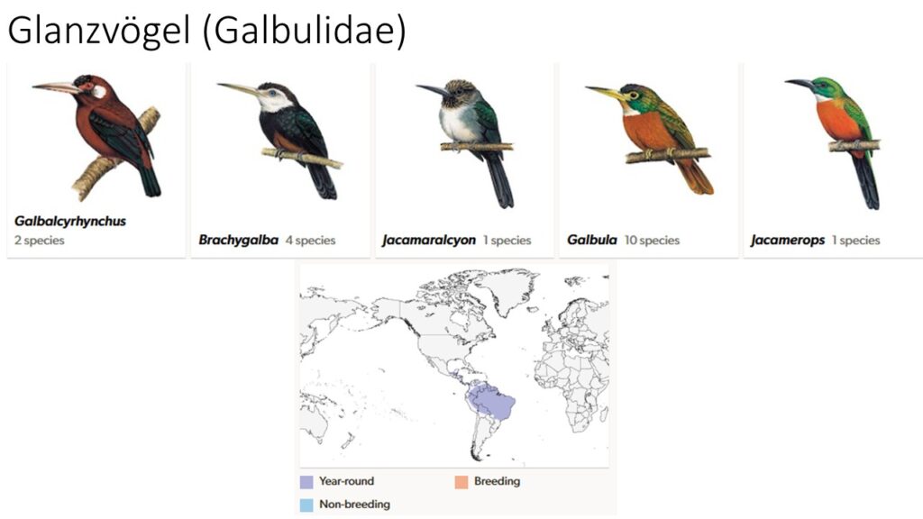 Glanzvögel (Galbulidae) erinnern an Eisvögel, haben aber die für Spechtvögel typischen Flügel und zygodactylen Füße. Anders als die übrigen Spechtvögel können sie nicht gut klettern, da ihre Beine zu schwach und die Schwanzfedern nicht verstärkt sind. Der Schnabel ist lang und speerförmig und die schlitzförmigen Nasenöffnungen werden von Borsten bedeckt. Die Glanzvögel kommen in 18 Arten in 5 Gattungen in den Tropen Mittel- und Südamerikas vor. Die Schwanzfedern sind bei den meisten Arten fächerartig angeordnet, bei manchen aber auch übereinander zusammengelegt, wobei die zwei mittleren Federn über die äußeren hervorragen. Das Gefieder ist goldgrün und smaragdgrün glänzend, die Schwungfedern sind dunkel und die Brust und der Bauch von rosa bis rotbraun gefärbt. Der unbefiederte Ring um die Augen hat eine schmale Verbindung zum Schnabel. In sitzender Haltung schieben die Vögel ihre Brust weit vor und heben den Kopf leicht an. Die Körperlänge beträgt 15 bis 30 cm, ihr Gewicht 15 bis 25 Gramm. Alle Glanzvögel sind Einzelgänger und leben an Waldrändern, nur in der Fortpflanzungszeit kommen sie zusammen. Sie ernähren sich hauptsächlich von Insekten, einige Arten haben sich auf die Schmetterlingsgattung Morpho spezialisiert. Die Nisthöhle wird in Uferböschungen oder die Bauten von Termiten mit ihren Füßen gegraben (Winkler et al. 2015, 2025a, Del Hoyo et al. 2002, Del Hoyo 2020).