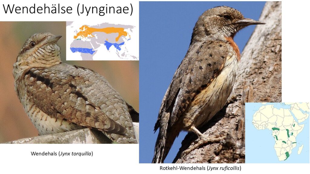 Spechte werden in vier Unterfamilien aufgeteilt (Sangster et al. 2022, Shakya et al. 2017, Fuchs et al. 2006, 2008, Fuchs & Pons 2015. Benz et al. 2006, Winkler et al. 2015, 2020g, Del Hoyo et al. 2002, Del Hoyo 2020). Die Unterfamilie Wendehälse (Jynginae) hat eine Gattung mit zwei Arten, die in Europa, Afrika und Asien leben. Ihren Namen haben diese Vögel von ihrer Fähigkeit, ihren Kopf um fast 180° zu drehen.