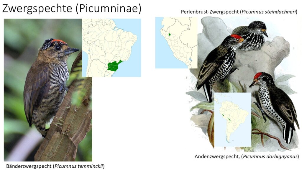Die zweite Unterfamilie sind die Zwergspechte (Picumninae) mit einer Gattung (Picumnus) und 25 bis 27 Arten. Im Gegensatz zu den Echten Spechten haben die Zwergspechte keinen Stützschwanz, da ihre Schwanzfedern nicht steif genug sind. Da ihr Schnabel nicht so stabil ist, bauen sie ihre Bruthöhlen nicht selbst, sondern nutzen verlassene Spechthöhlen. Sie sind durch einen relativ großen Kopf und eine lange Zunge gekennzeichnet und gehören zu den kleinsten Spechten. Eine Art lebt in China und Südostasien, die anderen in Süd- und Mittelamerika.