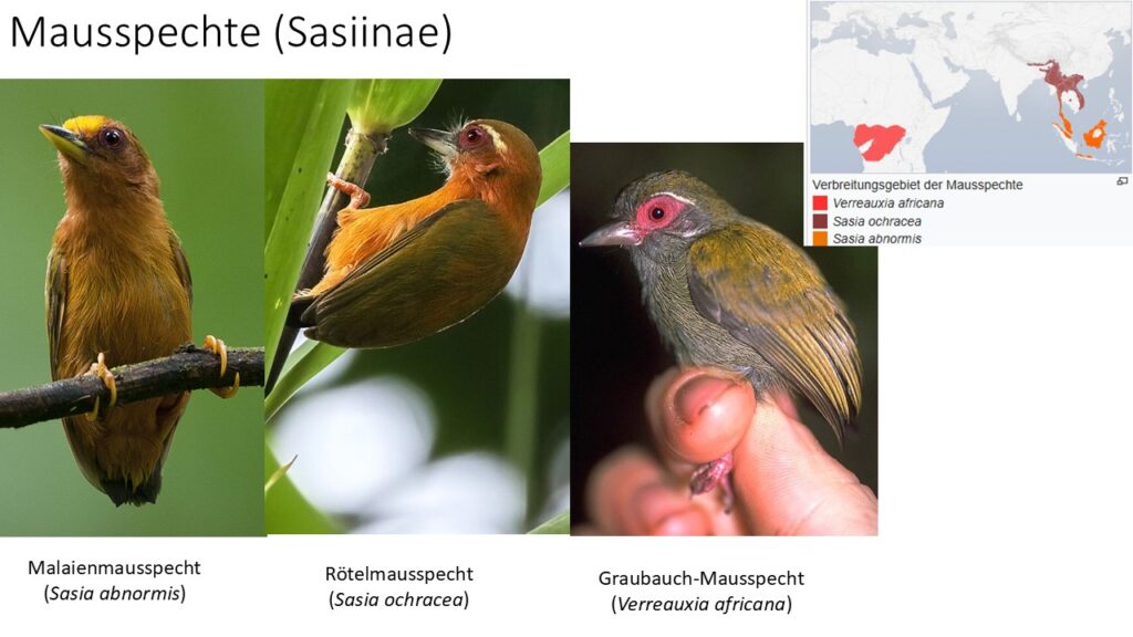 Die Unterfamilie der Mausspechte (Sasiinae) umfasst zwei Gattungen mit drei Arten, von denen eine Gattung (Sasia) mit zwei Arten in Südostasien und die dritte Art in Afrika lebt und in eine eigene Gattung (Verreauxia africana) gestellt wird. Diese kleinen Spechte wurden früher ebenfalls zu den Zwergspechten gezählt, gelten aber nach neusten Untersuchungen zu einer eigenen Unterfamilie.