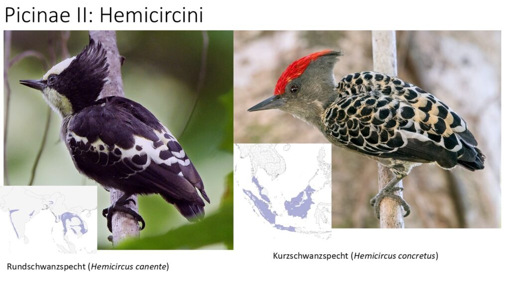 Manegold A, Töpfer T (2013). The systematic position of Hemicircus and the stepwise evolution of adaptations for drilling, tapping and climbing up in true woodpeckers (Picinae, Picidae). Journal of Zoological Systematics and Evolutionary Research. 51 (1): 72–82.