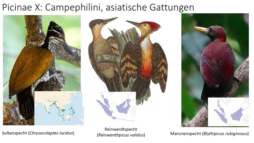 Die Gattungsgruppe der Campephilini hat vier Gattungen. Die Langhaubenspechte (Campephilus) haben 11 bis 12 Arten in Nord- und Südamerika, von denen zwei – der Elfenbeinspecht (Campephilus principalis) und der Kaiserspecht (Campephilus imperialis) – möglicherweise ausgestorben sind. Die Gattung Chrysocolaptes hat 8-10 Arten in Südostasien. Ebenfalls auf Südostasien beschränkt ist die Gattung Reinwardtipicus mit einer Art – dem Reinwardtspecht (Reinwardtipicus validus). Die Gattung Blythipicus hat zwei Arten, die ebenfalls in Südostasien vorkommen.