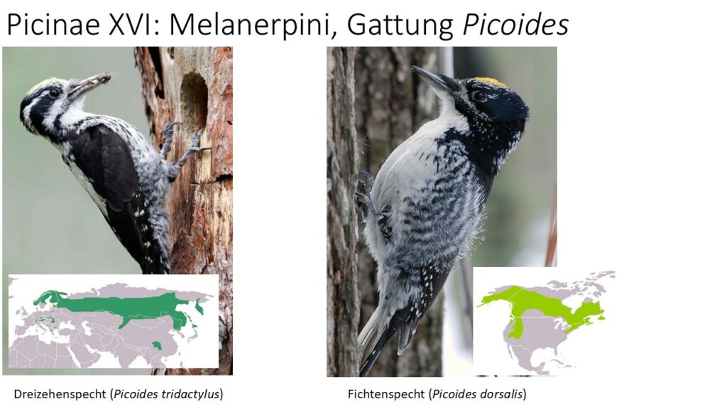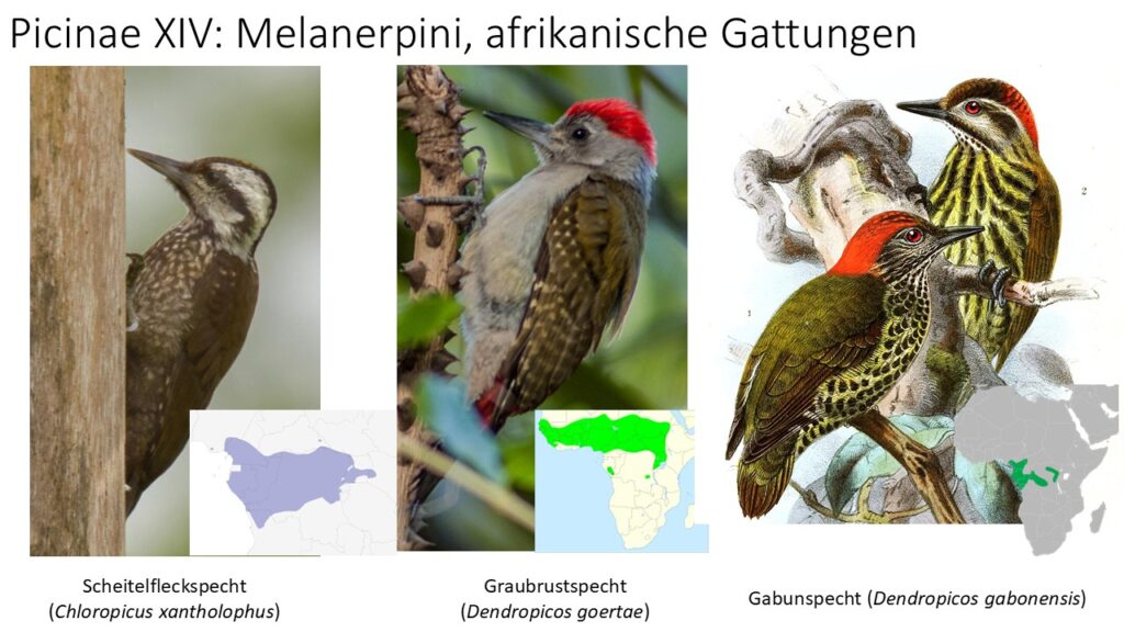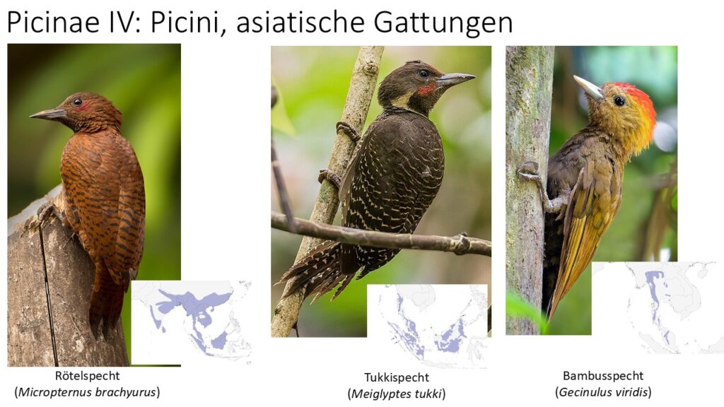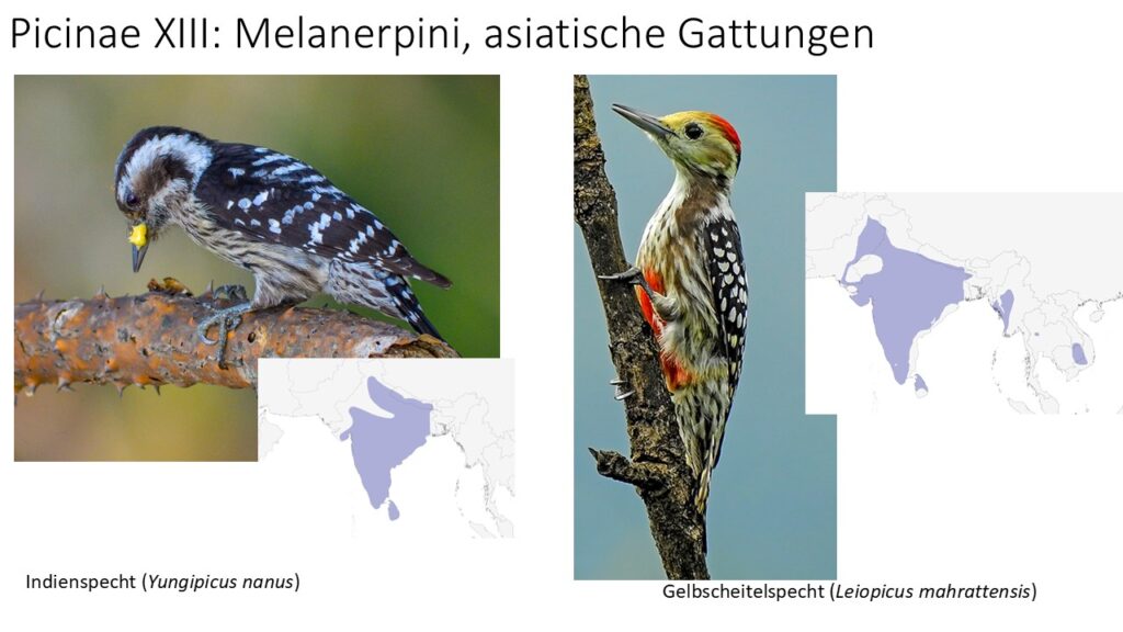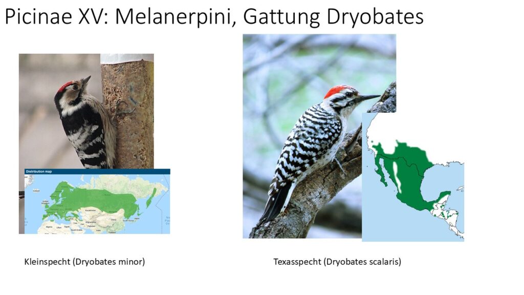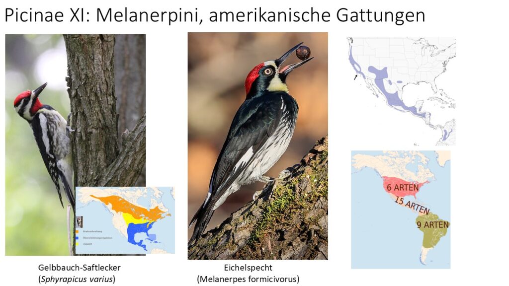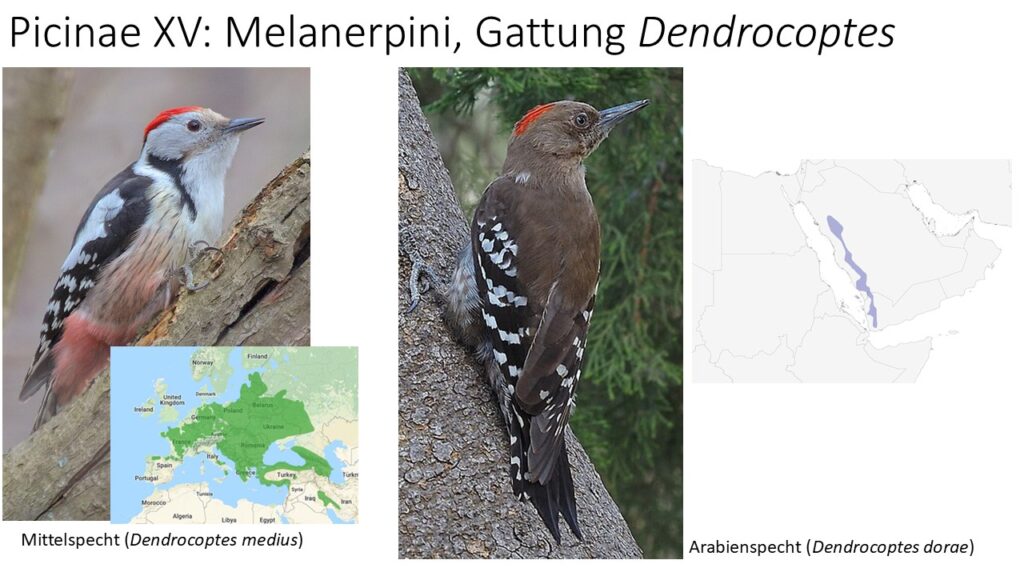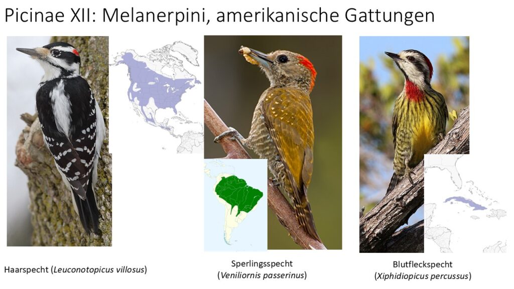 Die Gattungsgruppe Melanerpini hat 13 Gattungen. Die Saftlecker (Sphyrapicus) umfassen vier Arten aus Nordamerika. Ausschließlich in Nord- und Südamerika heimisch sind die Gattungen Melanerpes mit 23-24 Arten und Leuconotopicus mit 6 Arten. In Mittel- und Südamerika kommt die Gattung Veniliornis mit 14 Arten vor. Die Gattung Xiphidiopicus hat nur eine Art, den Blutfleckspecht (Xiphidiopicus percussus), der in Kuba lebt. In Asien kommen die Gattungen Yungipicus mit 7 Arten vorwiegend in den Tropen und Leiopicus mit einer Art auf dem indischen Subkontinent vor. In Afrika leben die Gattungen Chloropicus mit 3 Arten und Dendropicos mit 12-13 Arten. Zur Gattung Dendrocoptes gehören drei Arten, die in Europa und Asien vorkommen. Hierzu zählt auch der in Mitteleuropa heimische Mittelspecht (Dendrocoptes medius). In diese Gattung gehört auch der Arabienspecht (Dendrocoptes dorae), der früher in die afrikanische Gattung Dendropicos gestellt wurde. Die Gattung Dryobates hat 5-6 Arten und kommt in Europa, Asien und Nordamerika vor, darunter der auch der in Mitteleuropa brütende Kleinspecht (Dryobates minor). Die Gattung Picoides lebt in den gemäßigten Zonen Nordamerikas und Eurasiens, darunter der Dreizehenspecht (Picoides tridactylus). Die Gattung Dendrocopos hat 12-13 Arten, die über weite Teile des tropischen und gemäßigten Asiens, sowie Europa vorkommen. In diese Gattung gehören auch Weißrücken- (Dendrocopos leucotis), Blut- (Dendrocopos syriacus) und Buntspecht (Dendrocopos major), die in Mitteleuropa vorkommen.