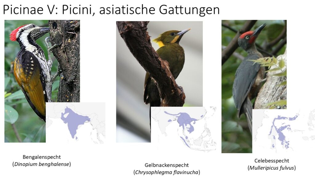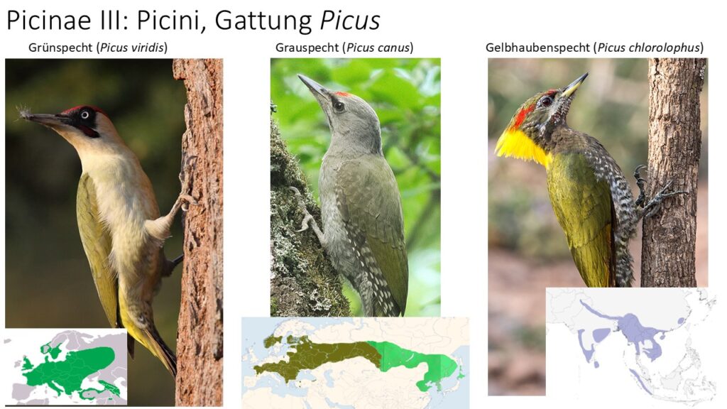 14 Gattungen zählen zur Gattungsgruppe der Picini. Hierzu gehört auch die Gattung Picus mit 13-15 Arten, die in Europa und Asien vorkommen, mit einem Verbreitungsschwerpunkt in den Tropen Asiens. In Mitteleuropa leben Grünspecht (Picus viridis) und Grauspecht (Picus canus). Weitere rein asiatische Gattungen sind der Rötelspecht (Micropternus brachyurus) mit einer Art, Meiglyptes mit 3-4, die Bambusspechte (Gecinulus) mit 2-3, Dinopium mit 5-6, Chrysophlegma mit 3-4 und Mulleripicus mit 4 Arten. In Afrika kommen die Gattungen Pardipicus mit 2 Arten, der Erdspecht (Geocolaptes olivaceus) mit einer Art und die Fleckenspechte (Campethera) mit 10-13 Arten vor. Die Gattung Dryocopus hat 6-7 Arten, die in Europa, Asien, Nord- und Südamerika vorkommen. Hierzu zählt auch der in Mitteleuropa vorkommende Schwarzspecht (Dryocopus martius). Die Gattung Celeus hat 12-15 Arten in Mittel- und Südamerika. Ebenfalls auf Mittel- und Südamerika beschränkt ist die Gattung Piculus mit 7 Arten. Die Gold- oder Krummschnabelspechte (Colaptes) kommen mit 13-19 Arten in Nord- und Südamerika vor.