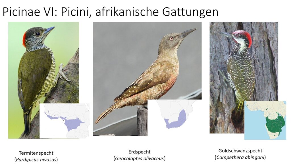 Es gibt also bei den heute lebenden Spechten eine graduelle Verlängerung der Zungenbeinhörner und solch ein Formenkontinuum finden wir auch bei anderen Spechtmerkmalen. Wendehälse und Zwergspechte habe zwar lange Zungen, ihnen fehlt aber die Spezialisierung Löcher in Baumstämme zu meißeln oder die versteiften Schwanzfedern um vertikal die Bäume hochzulaufen. Der Wüstengoldspecht (Colaptes chrysoides) benutzt seine lange Zunge, um Beute vom Boden aufzusammeln. Er hat nur wenige stoßdämpfende Anpassungen und zieht es vor, sich vom Boden zu ernähren oder an verrottendem Holz und Rinde zu knabbern – Gewohnheiten, die auch bei Vögeln außerhalb der Spechtfamilie zu beobachten sind. Spechte sind also eine sehr außergewöhnliche Familie, sie sind aber keine Herausforderung für die Evolutionstheorie (Ryan 2003, Manegold & Töpfer 2013).