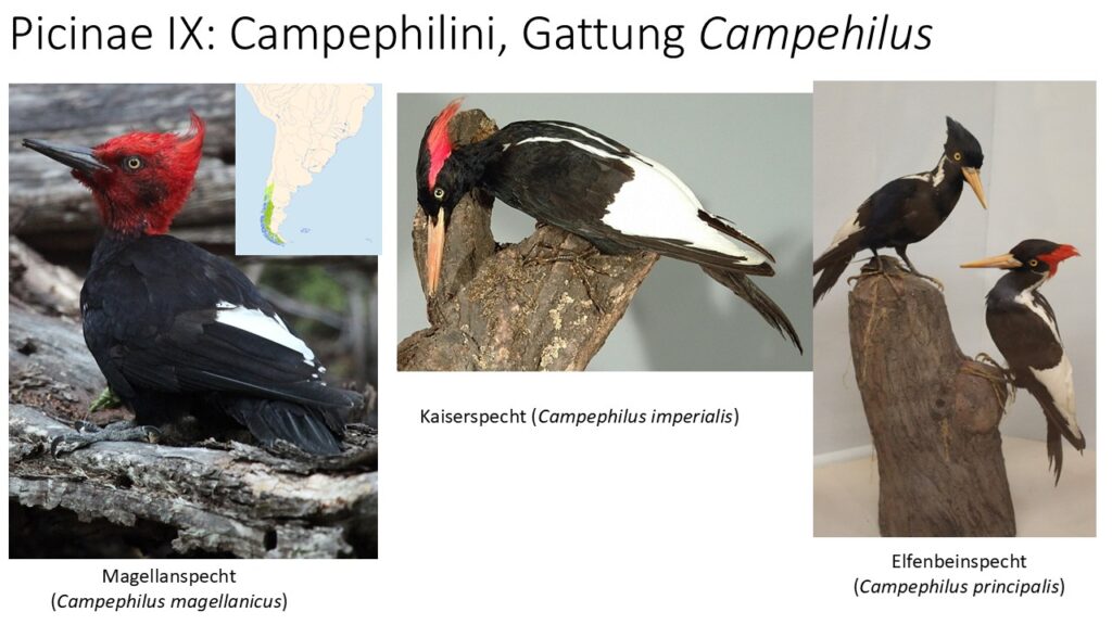 Die Gattungsgruppe der Campephilini hat vier Gattungen. Die Langhaubenspechte (Campephilus) haben 11 bis 12 Arten in Nord- und Südamerika, von denen zwei – der Elfenbeinspecht (Campephilus principalis) und der Kaiserspecht (Campephilus imperialis) – möglicherweise ausgestorben sind. Die Gattung Chrysocolaptes hat 8-10 Arten in Südostasien. Ebenfalls auf Südostasien beschränkt ist die Gattung Reinwardtipicus mit einer Art – dem Reinwardtspecht (Reinwardtipicus validus). Die Gattung Blythipicus hat zwei Arten, die ebenfalls in Südostasien vorkommen.