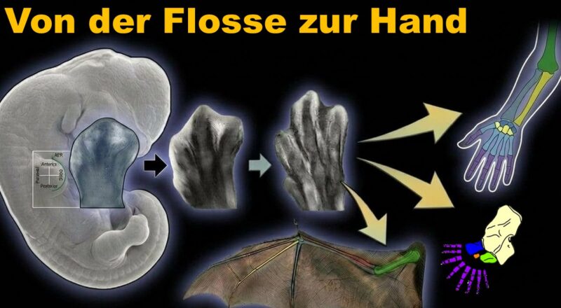 Betrachtet mal eure Gliedmaßen. An einem Ende befinden sich Finger oder Zehen, am anderen Ende Oberarmknochen oder Oberschenkelknochen. Niemand hat Finger in der Mitte seines Arms. Betrachtet auch die subtilen, aber offensichtlichen Unterschiede zwischen unseren Händen und Füßen. Wenn unsere Finger durch Zehen ersetzt würden, würden wir das sicherlich bemerken, denn es sehe echt merkwürdig aus. Trotz dieser Unterschiede ähneln die Knochen unserer Füße den Knochen unserer Hände. Es ist leicht zu erkennen, dass sie ein gemeinsames Muster aufweisen. Und schließlich sollten wir bedenken, dass unsere beiden Hände ebenso wie unsere beiden Füße bemerkenswert ähnlich groß sind. Diese alltäglichen Phänomene werfen für Entwicklungsbiologen faszinierende Fragen auf. Wie kommt es, dass Wirbeltiere vier Gliedmaßen haben und nicht sechs oder acht? Wie kommt es, dass sich der kleine Finger an einem Ende der Gliedmaße und der Daumen am anderen Ende entwickelt? Wie wächst die Vordergliedmaße anders als die Hintergliedmaße? Wie kann die Größe der Gliedmaßen so präzise reguliert werden? Gibt es einen konservierten Satz von Entwicklungsmechanismen, der erklären kann, warum unsere Hände fünf Finger haben, ein Hühnerflügel drei und ein Pferdehuf einen? Die Entstehung der Gliedmaßen ist eines der spannendsten Forschungsfelder innerhalb der Evo-Devo-Forschung. Hiermit schlagen wir auch eine Brücke zur vorherigen Episode, wo wir uns die konstruktionsmorphologischen und paläontologischen Aspekte der Entstehung der Gliedmaßen betrachtet haben.